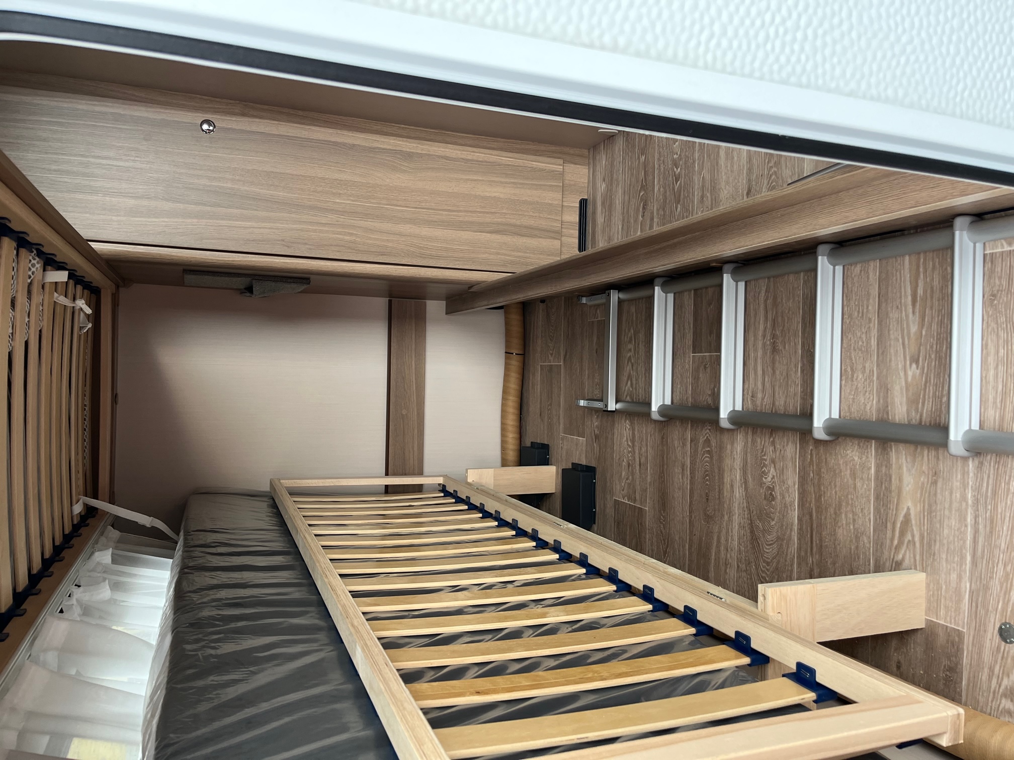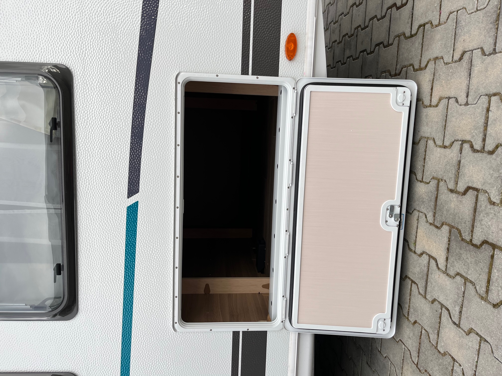 pozinkovaný podvozok, nájazdový brzdový systém, automatický spätný chod, oceľové disky 185 R14 C 8 PR, do 1600 kg (vrátane), kvalitné pneumatiky určené pre rýchlosť do 100 km/h, ľahké pozinkované oporné nohy, výklopné a izolované okná (grafitovo šedé) s moskytiérou a zatemnením, podlaha pre plynové fľaše odolná voči hnitiu z kvalitného hliníku, predná časť, strecha a zadná časť z odolného GFK, dvojdielne vstupné dvere, skrinka na 2 plynové fľaše po 11 kg, hliníkové, hrubozrnné biele bočné steny, úložný priestor vzadu vpravo 560 x 1150 mm, dekór dreva Sambesi Oak, poťahy Clipper, matrac zo studenej peny pre dvojlôžko, Air Plus - dokonalá cirkulácia vzduchu v interiéri + odvetrávané skrinky a úl. priestory, poschodové postele so zábranou proti vypadnutiu a nástupným rebríkom, sedacia súprava rozložiteľná na spaciu plochu, drevený posteľný rošt vysokej kvality, rám zdvíhateľný pre prístup k úl. priestoru pod posteľou, poschodová posteľ výklopná s dvomi jednolôžkami, praktický 3 horákový varič s manuálnym zapaľovaním, plnoautomatická chladnička Thetford 78 l – 12V/230V/plyn, strešné okno v kúpeľni s moskytiérou, sprchovacia vanička, dizajnové umývadlo z ušľachtilej ocele, kúrenie S 3004, 2 V zásobovanie v celom vozidle, CEE vonkajšia zásuvka na 230 V, kompaktný elektro-blok s 230 V poistkovým automatom a s 12 V poistkou v šatníkovej skrini a výkonný 340 W menič, predstanové svetlo 12 V, elektrický prívod vody, nádrž na čistú vodu 12 l, Touring balíček C´Joy (prívod teplej vody, teplovzdušné kúrenie, strešné okno 700 x 500 mm, protihmyzová sieťka do dverí), sprchovacia sada, Dynamic balíček (stabilizačné spájacie zariadenie, Alko oktagon tlmiče, držiak na rezervu v skrini na plynové fľaše, 44 l nádrž na čistú vodu, 23 l nádrž s kolieskami na odpadovú vodu, úložný priestor vpredu vpravo 1000 x 420 mm), Autark balíček (batéria 95 Ah, nabíjačka batérie, centrálny 12 V hlavný spínač, ukazovateľ napätia), plnoautomatický satelitný systém Carbest ⌀85cm, 21,5“ LED TV s držiakom, solárny panel, markíza, klimatizácia, 2x nosič na 2 bicykle, mover, vonkajšia plynová zásuvka