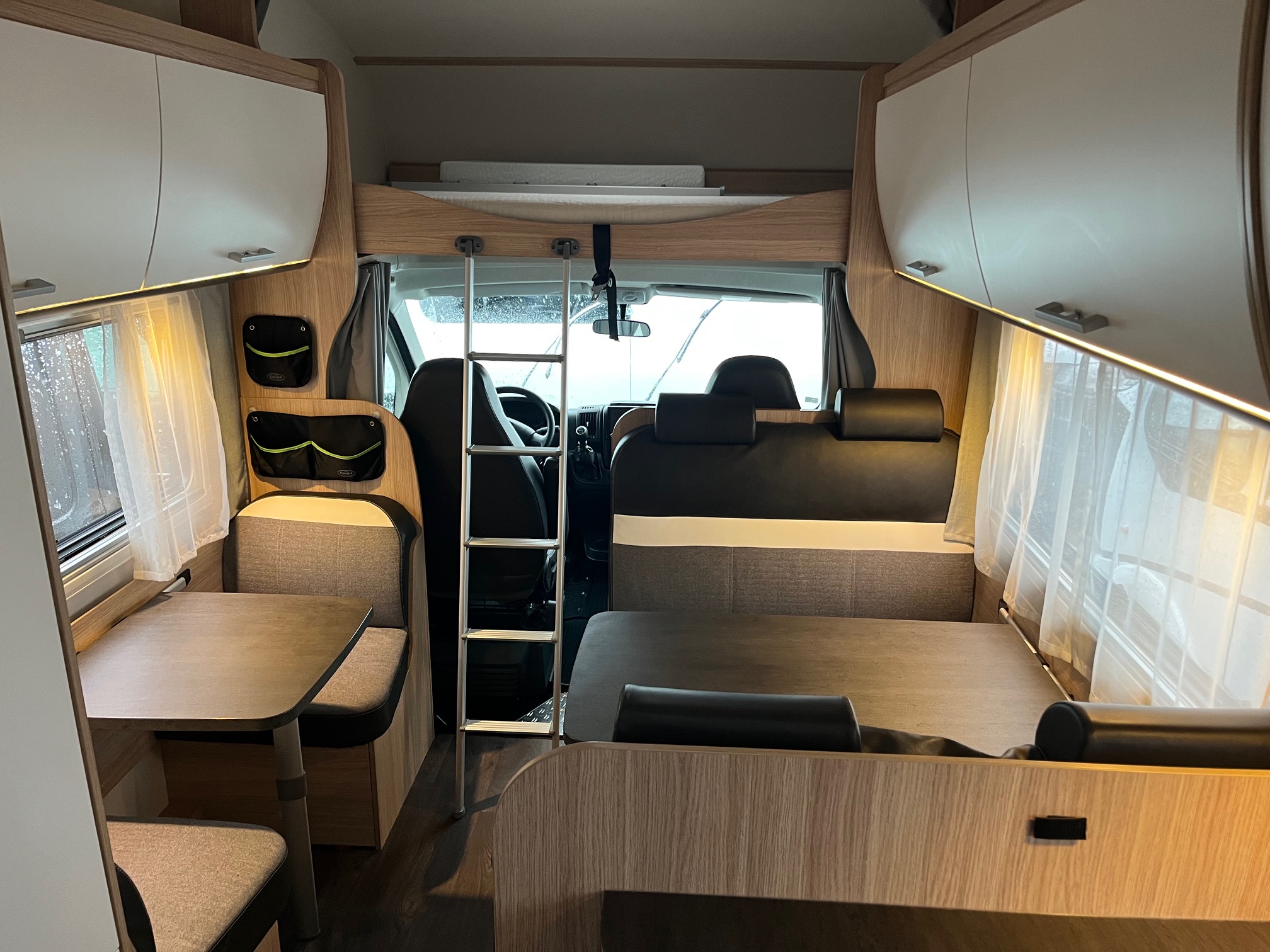 Ergonomicky tvarované podušky pre viac pohodlia pri sedení, kvalitné matrace pri všetkých posteliach pre zvýšený komfort pri sedení, poťahy matracov odnímateľné s vhodné na pranie v práčke, drevený posteľný rošt pri všetkých pevných posteliach pre zvýšený komfort, pohodlné alkovne s bočným oknom vpravo, teplovzdušnými výduchmi, 72 cm výška pre hlavu a s veľkosťou lôžka 210 x 160 cm, sklápacia posteľ v alkovni pre lepší prístup ku kabíne, bezpečnostné siete na posteli v alkovni, poschodových posteliach a pri spúšťacích posteliach veľkorysé odkladacie a úložné priestory, odvetrávanie za skrinkami, dekor dreva Sensual Oak a Cosy White, podlaha Classic Ambience