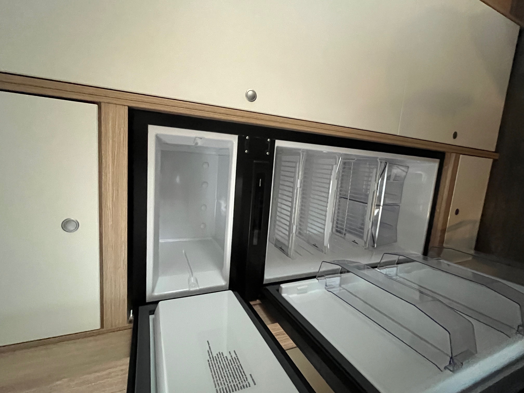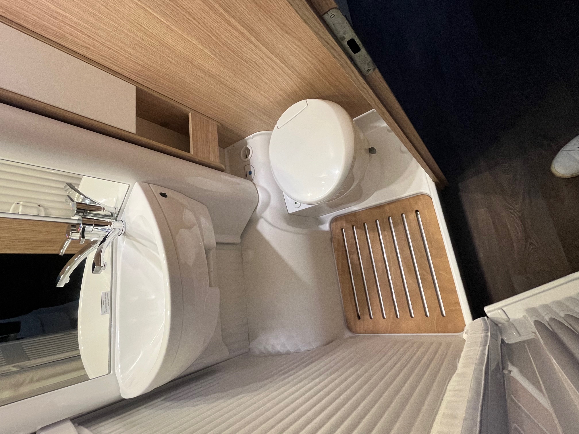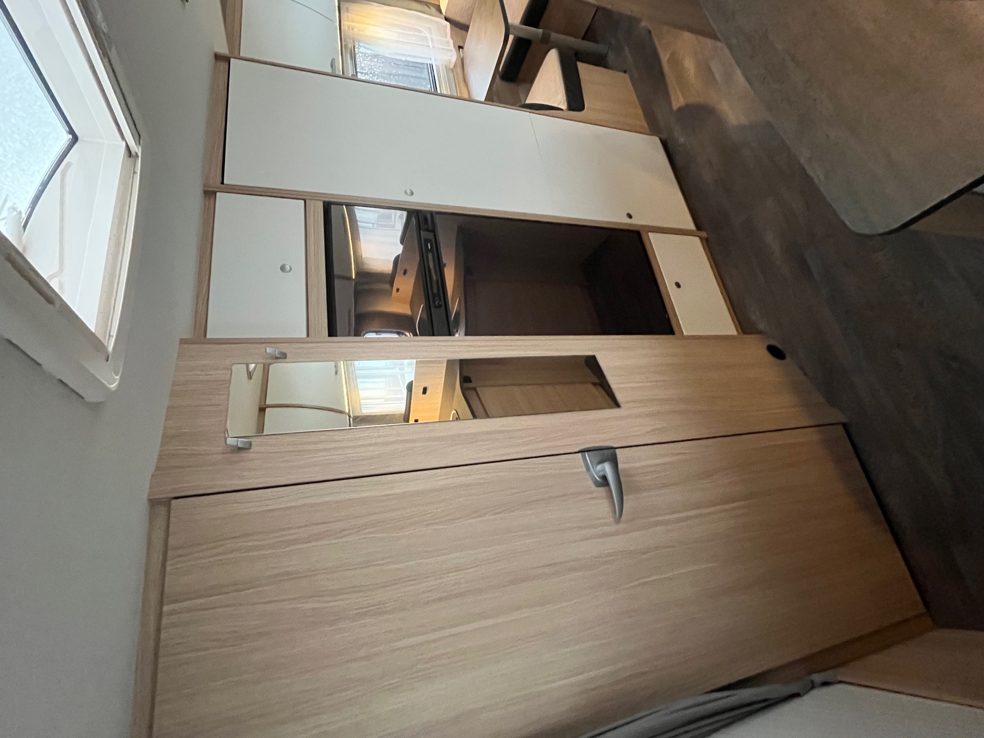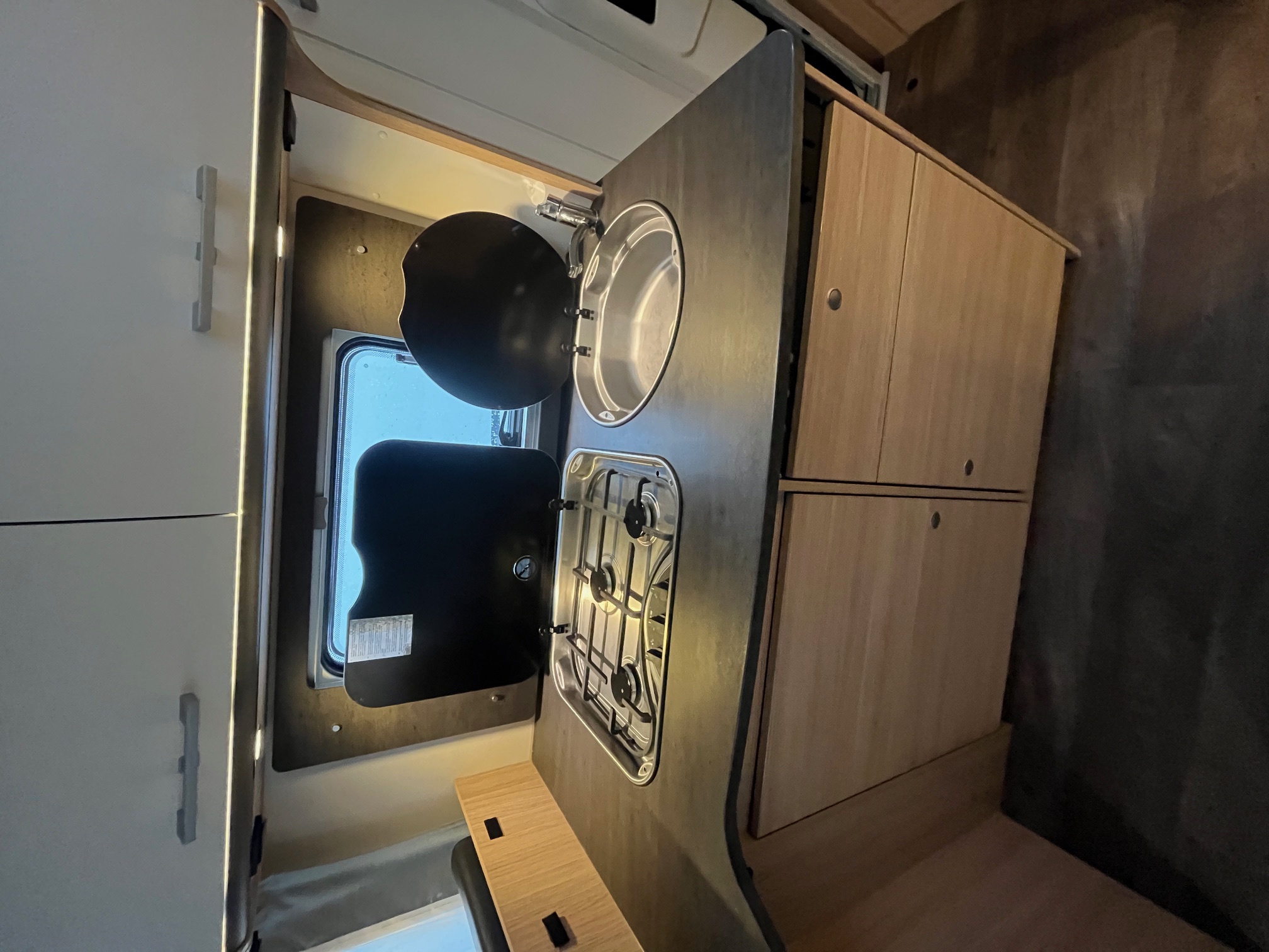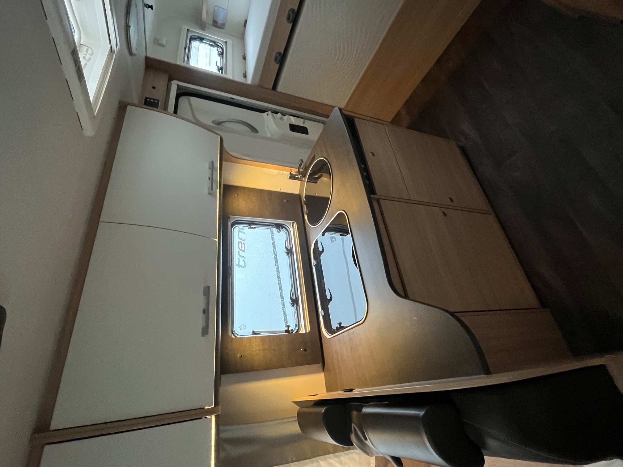 Ergonomicky usporiadaná kuchyňa s veľkorysou pracovnou plochou, priestranné šuplíky v kuchynke s dojazdom, Thetford 3-horákový šporák s liatinovými mriežkami a skleneným krytom, veľké okrúhle umývadlo z ušľachtilej ocele s čiernym skleneným krytom, nádrž na čistú vodu vrátane bojleru 122 l, nádrž na odpadovú vodu 92 l, Thetford chladnička 113 l s mraziacim boxom 14 l, LED osvetlenie, odpadový kôš