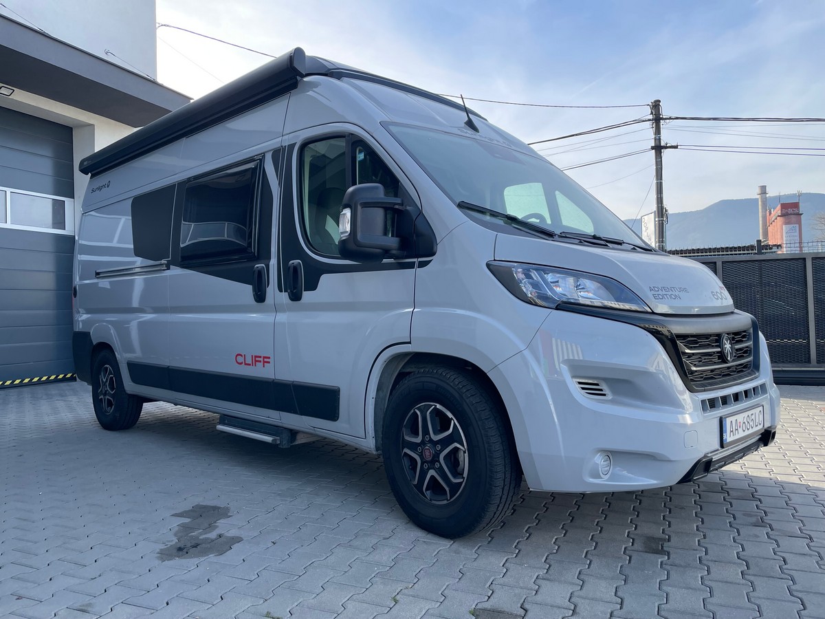 Fiat Ducato 3 500 kg | 2.2 MultiJet | 103 kW | 140 PS Euro 6 | 8-stupňová automatická prevodovka, farba podvozku Campovolo, izolovaná vyhrievaná odpadová nádrž, 90 l palivová nádrž, snínač tlaku v pneumatikách, drevený rošt v sprche, kúrenie naftové Combi 4, autorádio s cúvacou kamerou, Cliff RT balíček (spacia strecha), ťažné zariadenie, Monocontrol