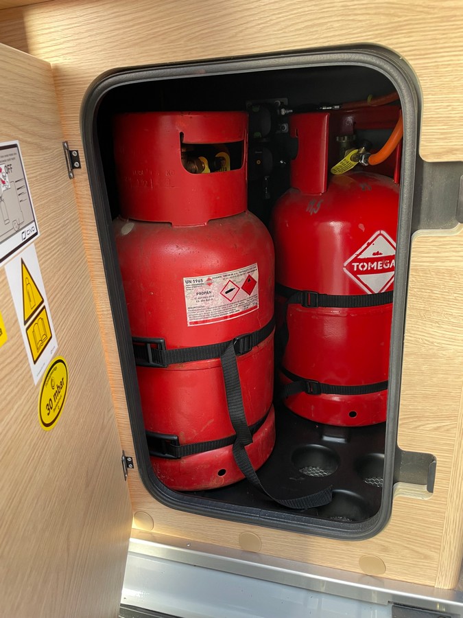 Kúrenie / Plyn: skrinka pre 2 plynové fľaše s maximálnou hmotnosťou 11 kg, dobre prístupné a centrálne usporiadané plynové uzatváracie ventily