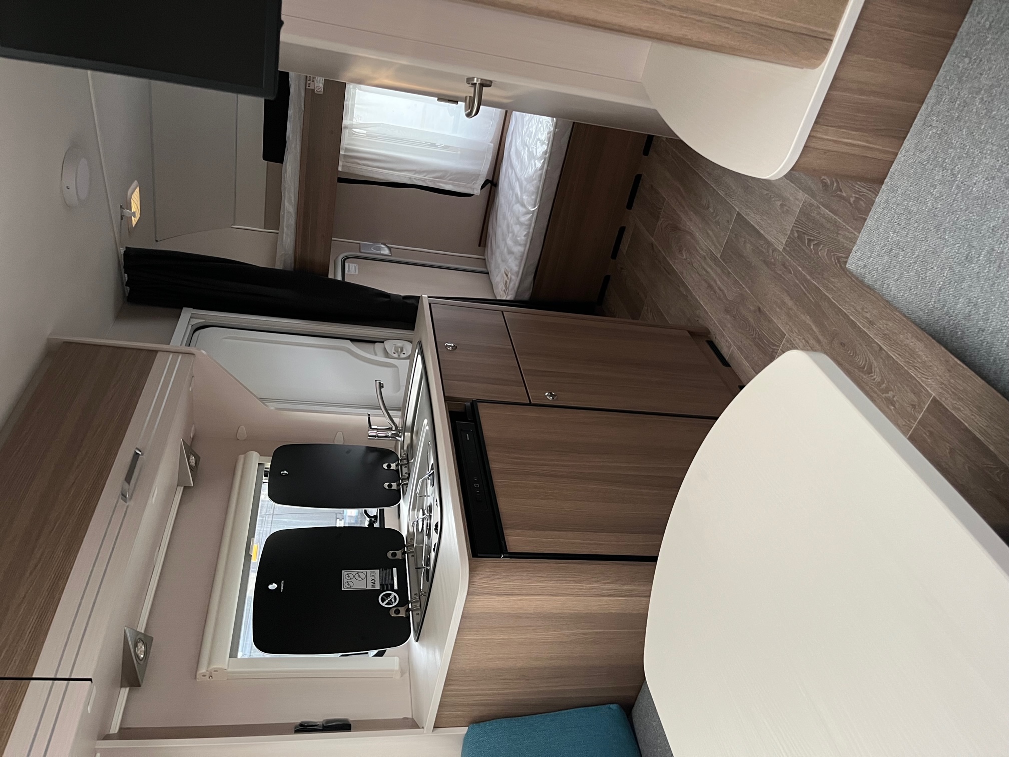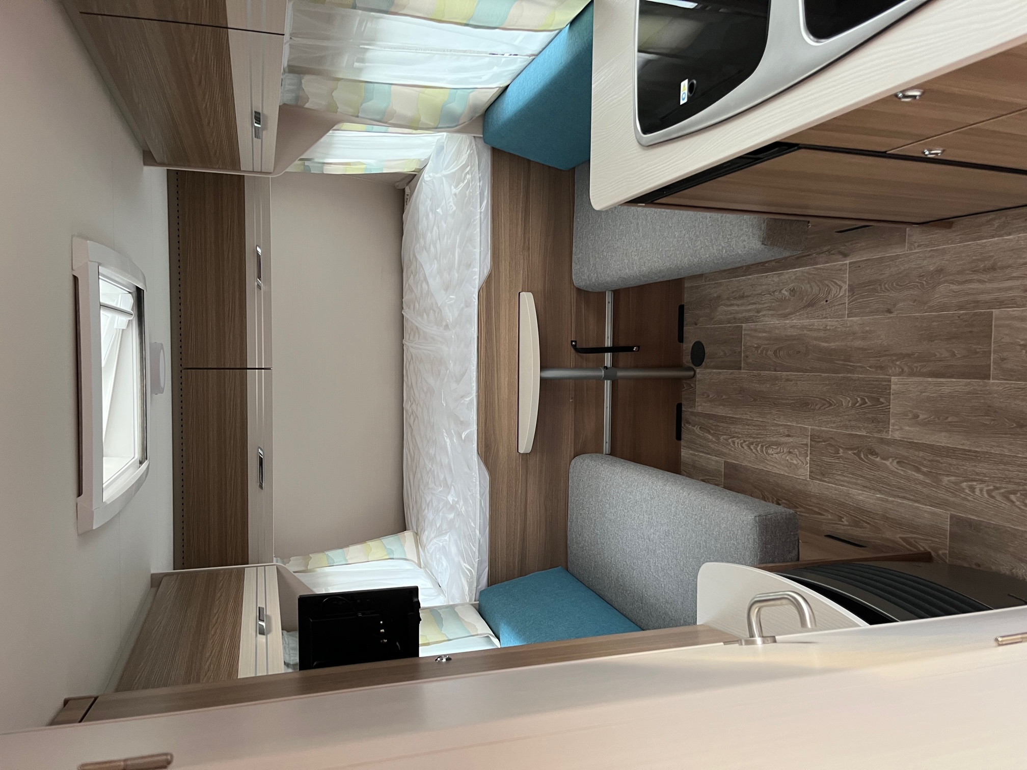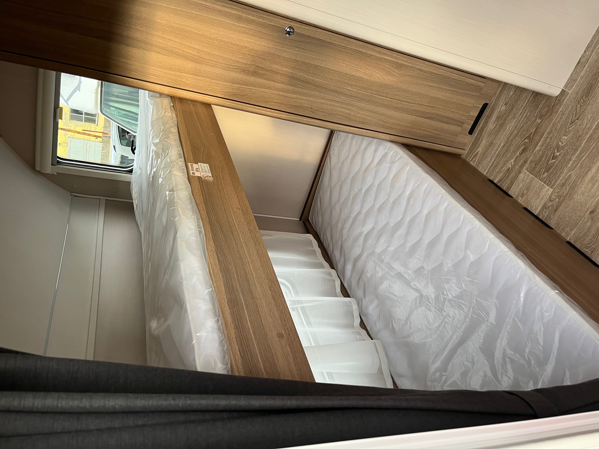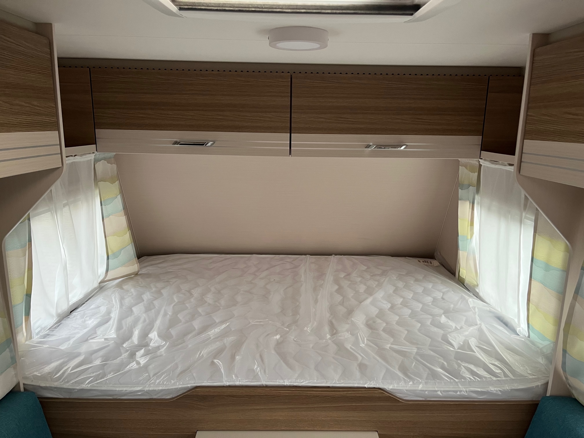 pozinkovaný podvozok, nájazdový brzdový systém, automatický spätný chod, oceľové disky 185 R14 C 8 PR, do 1600 kg (vrátane), kvalitné pneumatiky určené pre rýchlosť do 100 km/h, ľahké pozinkované oporné nohy, výklopné a izolované okná (grafitovo šedé) s moskytiérou a zatemnením, podlaha pre plynové fľaše odolná voči hnitiu z kvalitného hliníku, predná časť, strecha a zadná časť z odolného GFK, dvojdielne vstupné dvere, skrinka na 2 plynové fľaše po 11 kg, hliníkové, hrubozrnné biele bočné steny, úložný priestor vzadu vpravo 560 x 1150 mm, dekór dreva Sambesi Oak, poťahy Clipper, matrac zo studenej peny pre dvojlôžko, Air Plus - dokonalá cirkulácia vzduchu v interiéri + odvetrávané skrinky a úl. priestory, poschodové postele so zábranou proti vypadnutiu a nástupným rebríkom, sedacia súprava rozložiteľná na spaciu plochu, drevený posteľný rošt vysokej kvality, rám zdvíhateľný pre prístup k úl. priestoru pod posteľou, poschodová posteľ výklopná s dvomi jednolôžkami, praktický 3 horákový varič s manuálnym zapaľovaním, plnoautomatická chladnička Thetford 78 l – 12V/230V/plyn, strešné okno v kúpeľni s moskytiérou, sprchovacia vanička, dizajnové umývadlo z ušľachtilej ocele, kúrenie S 3004, 2 V zásobovanie v celom vozidle, CEE vonkajšia zásuvka na 230 V, kompaktný elektro-blok s 230 V poistkovým automatom a s 12 V poistkou v šatníkovej skrini a výkonný 340 W menič, predstanové svetlo 12 V, elektrický prívod vody, nádrž na čistú vodu 12 l, Touring balíček C´Joy (prívod teplej vody, teplovzdušné kúrenie, strešné okno 700 x 500 mm, protihmyzová sieťka do dverí), sprchovacia sada, Dynamic balíček (stabilizačné spájacie zariadenie, Alko oktagon tlmiče, držiak na rezervu v skrini na plynové fľaše, 44 l nádrž na čistú vodu, 23 l nádrž s kolieskami na odpadovú vodu, úložný priestor vpredu vpravo 1000 x 420 mm), Autark balíček (batéria 95 Ah, nabíjačka batérie, centrálny 12 V hlavný spínač, ukazovateľ napätia), plnoautomatický satelitný systém Carbest ⌀85cm, 21,5“ LED TV s držiakom, solárny panel, markíza, klimatizácia, 2x nosič na 2 bicykle, mover, vonkajšia plynová zásuvka