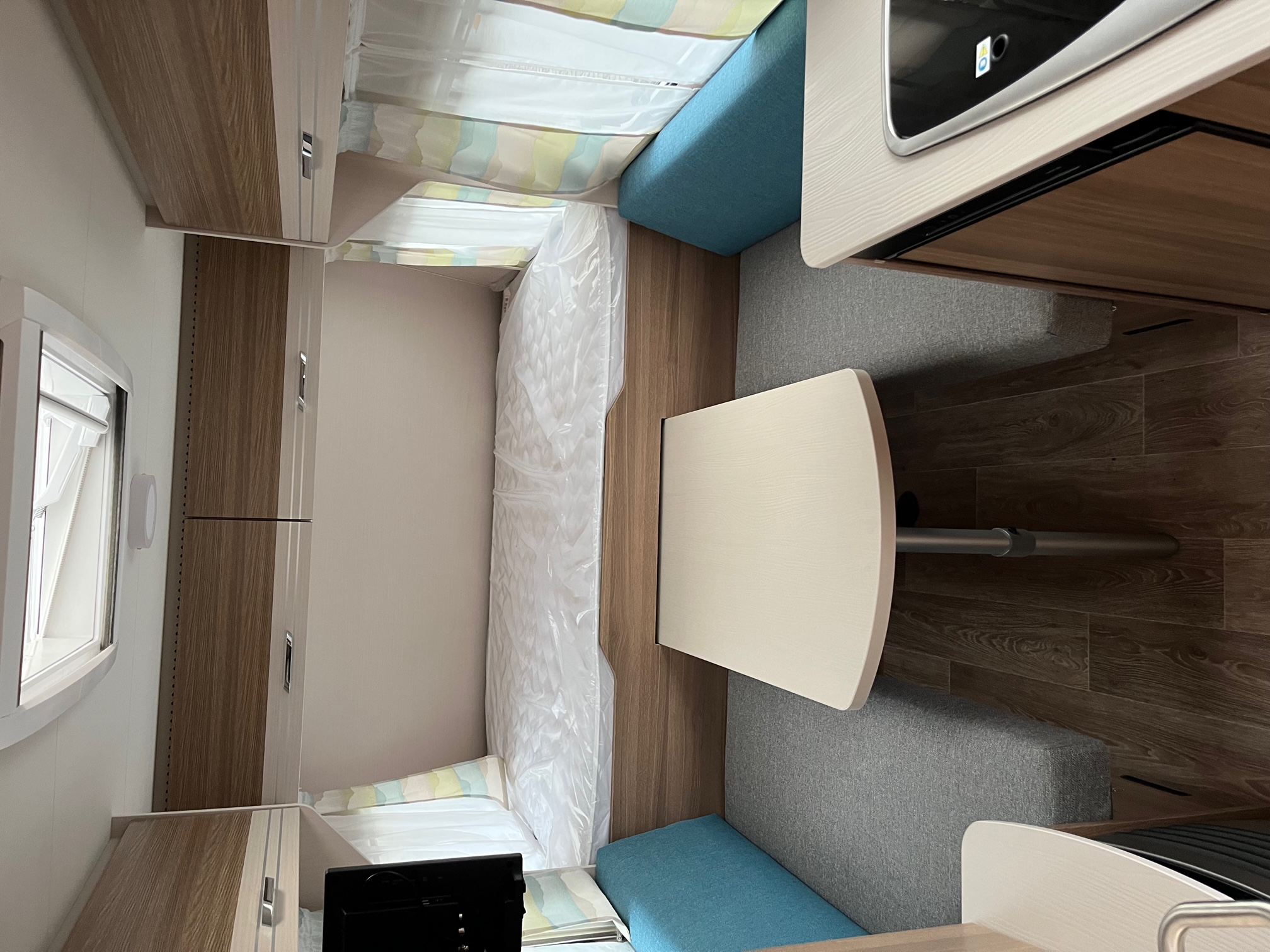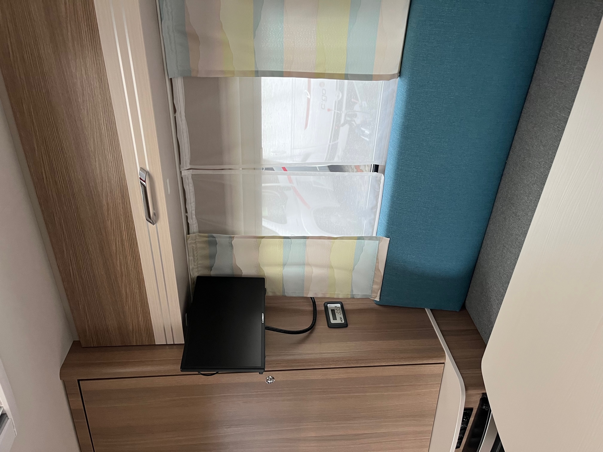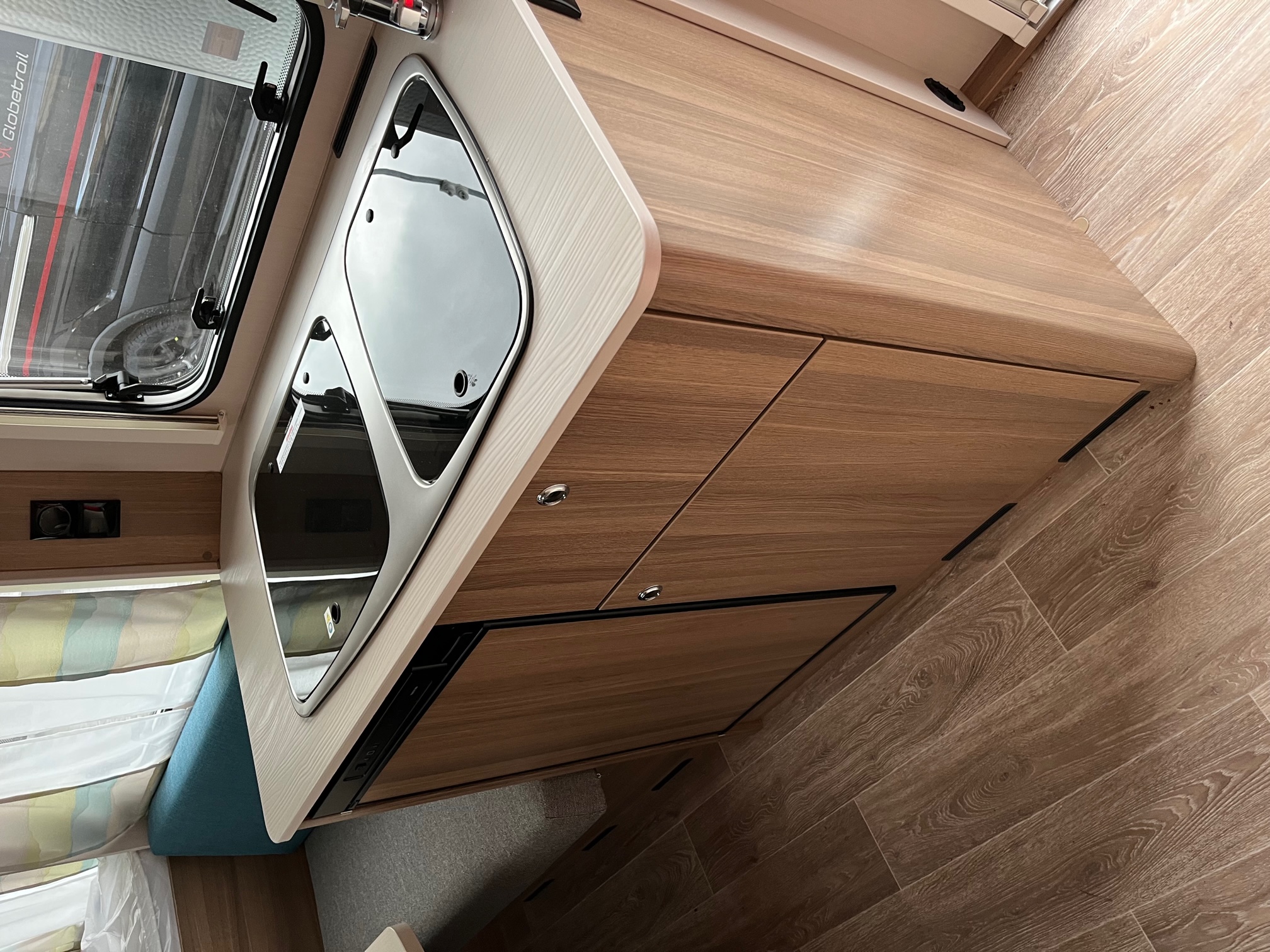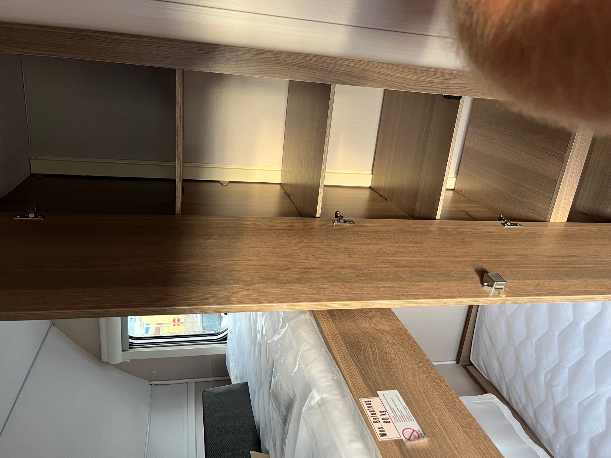 pozinkovaný podvozok, nájazdový brzdový systém, automatický spätný chod, oceľové disky 185 R14 C 8 PR, do 1600 kg (vrátane), kvalitné pneumatiky určené pre rýchlosť do 100 km/h, ľahké pozinkované oporné nohy, výklopné a izolované okná (grafitovo šedé) s moskytiérou a zatemnením, podlaha pre plynové fľaše odolná voči hnitiu z kvalitného hliníku, predná časť, strecha a zadná časť z odolného GFK, dvojdielne vstupné dvere, skrinka na 2 plynové fľaše po 11 kg, hliníkové, hrubozrnné biele bočné steny, úložný priestor vzadu vpravo 560 x 1150 mm, dekór dreva Sambesi Oak, poťahy Clipper, matrac zo studenej peny pre dvojlôžko, Air Plus - dokonalá cirkulácia vzduchu v interiéri + odvetrávané skrinky a úl. priestory, poschodové postele so zábranou proti vypadnutiu a nástupným rebríkom, sedacia súprava rozložiteľná na spaciu plochu, drevený posteľný rošt vysokej kvality, rám zdvíhateľný pre prístup k úl. priestoru pod posteľou, poschodová posteľ výklopná s dvomi jednolôžkami, praktický 3 horákový varič s manuálnym zapaľovaním, plnoautomatická chladnička Thetford 78 l – 12V/230V/plyn, strešné okno v kúpeľni s moskytiérou, sprchovacia vanička, dizajnové umývadlo z ušľachtilej ocele, kúrenie S 3004, 2 V zásobovanie v celom vozidle, CEE vonkajšia zásuvka na 230 V, kompaktný elektro-blok s 230 V poistkovým automatom a s 12 V poistkou v šatníkovej skrini a výkonný 340 W menič, predstanové svetlo 12 V, elektrický prívod vody, nádrž na čistú vodu 12 l, Touring balíček C´Joy (prívod teplej vody, teplovzdušné kúrenie, strešné okno 700 x 500 mm, protihmyzová sieťka do dverí), sprchovacia sada, Dynamic balíček (stabilizačné spájacie zariadenie, Alko oktagon tlmiče, držiak na rezervu v skrini na plynové fľaše, 44 l nádrž na čistú vodu, 23 l nádrž s kolieskami na odpadovú vodu, úložný priestor vpredu vpravo 1000 x 420 mm), Autark balíček (batéria 95 Ah, nabíjačka batérie, centrálny 12 V hlavný spínač, ukazovateľ napätia), plnoautomatický satelitný systém Carbest ⌀85cm, 21,5“ LED TV s držiakom, solárny panel, markíza, klimatizácia, 2x nosič na 2 bicykle, mover, vonkajšia plynová zásuvka