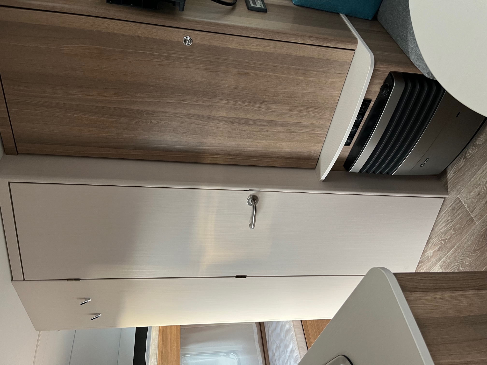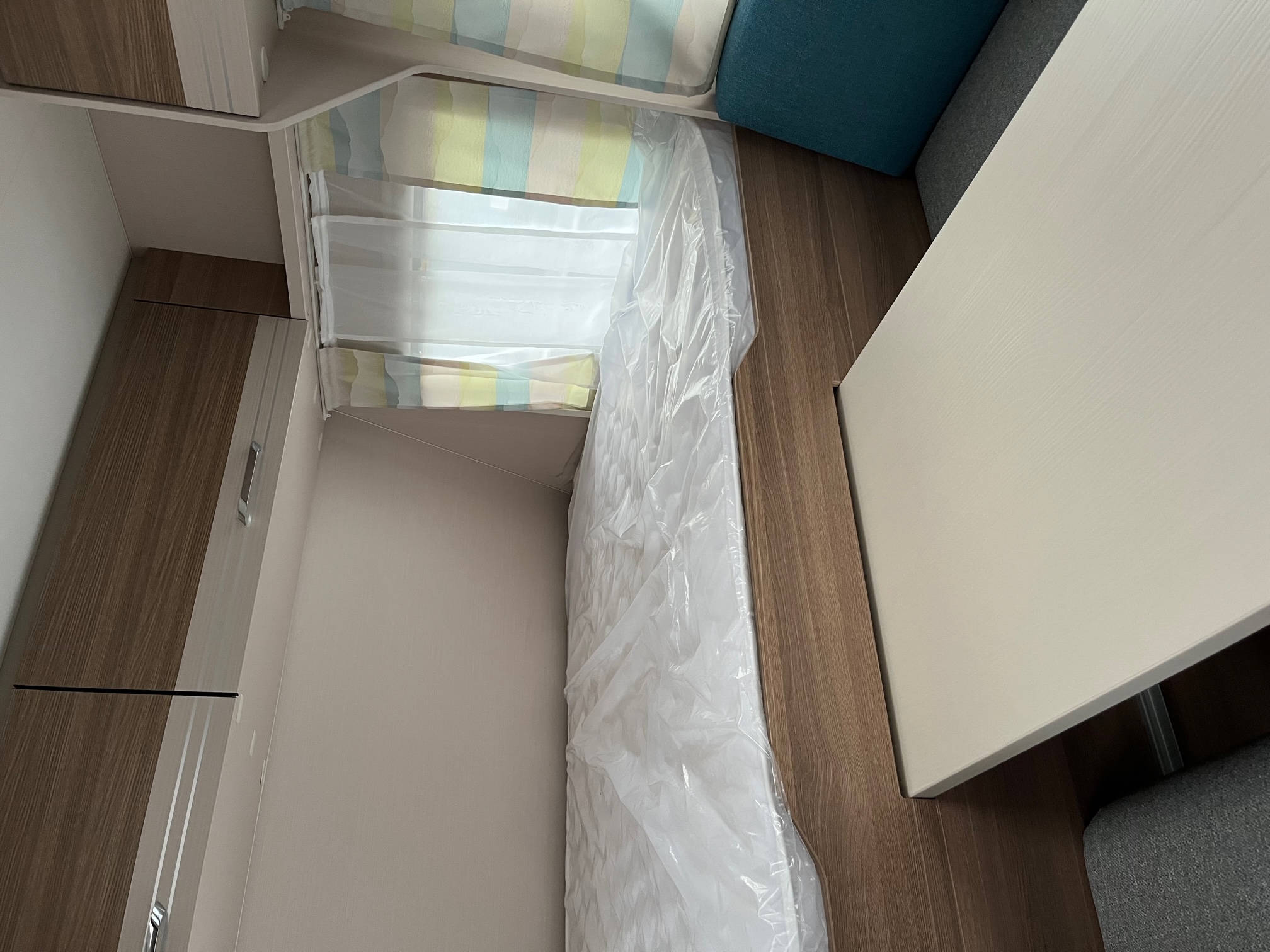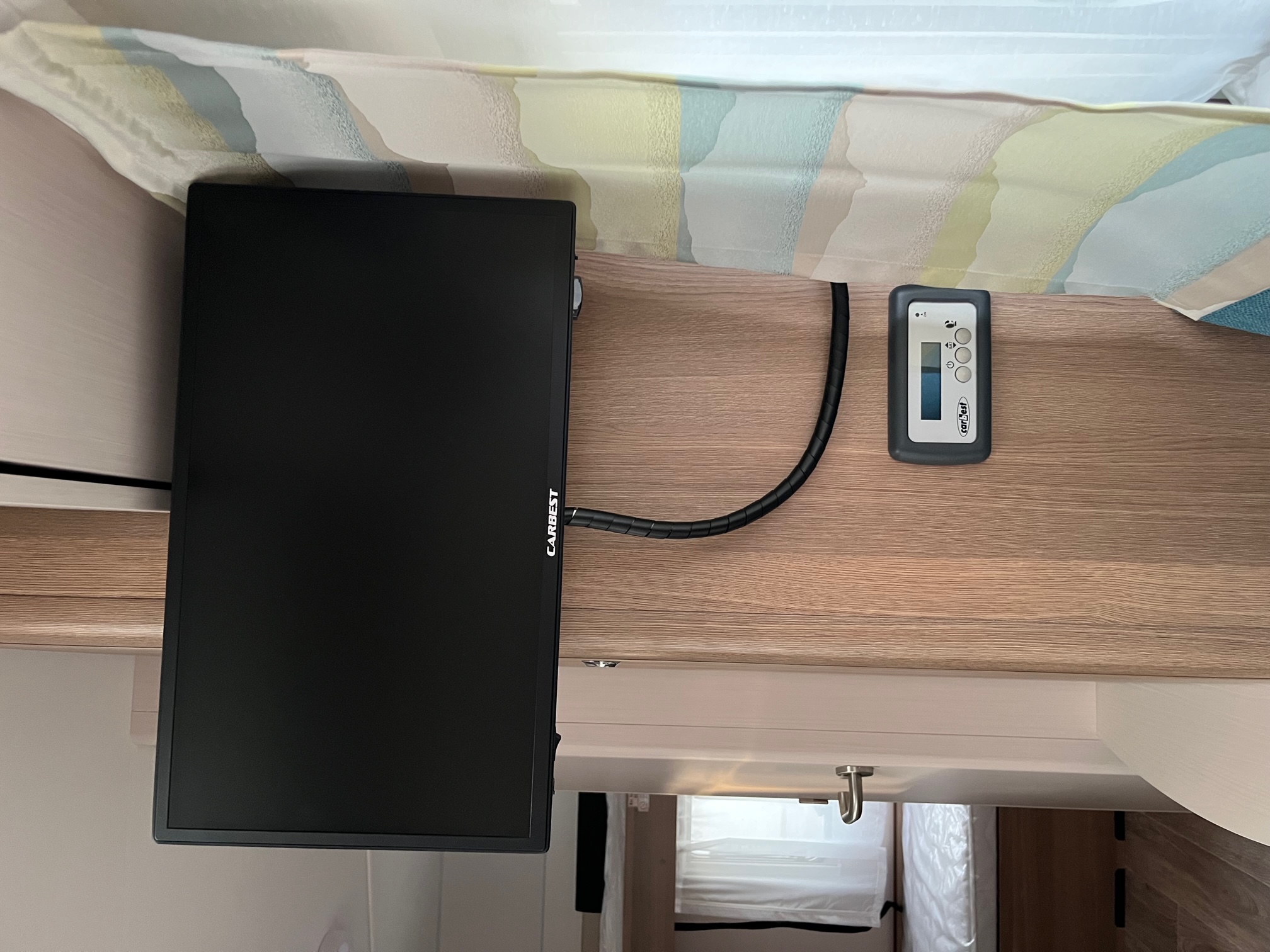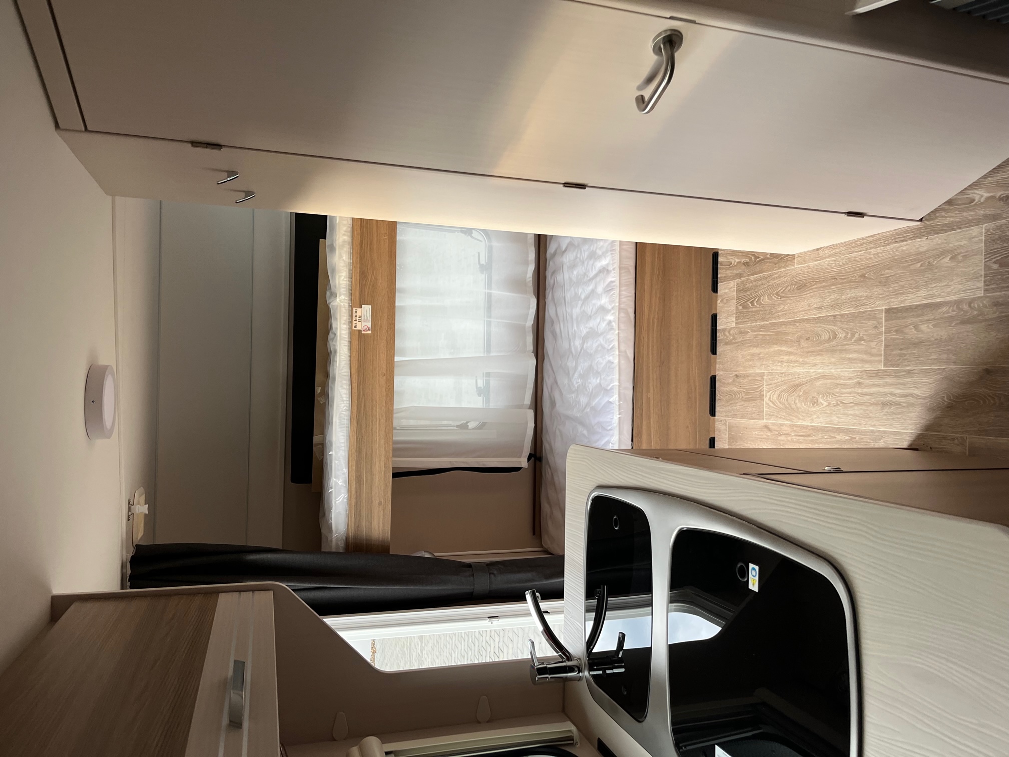 pozinkovaný podvozok, nájazdový brzdový systém, automatický spätný chod, oceľové disky 185 R14 C 8 PR, do 1600 kg (vrátane), kvalitné pneumatiky určené pre rýchlosť do 100 km/h, ľahké pozinkované oporné nohy, výklopné a izolované okná (grafitovo šedé) s moskytiérou a zatemnením, podlaha pre plynové fľaše odolná voči hnitiu z kvalitného hliníku, predná časť, strecha a zadná časť z odolného GFK, dvojdielne vstupné dvere, skrinka na 2 plynové fľaše po 11 kg, hliníkové, hrubozrnné biele bočné steny, úložný priestor vzadu vpravo 560 x 1150 mm, dekór dreva Sambesi Oak, poťahy Clipper, matrac zo studenej peny pre dvojlôžko, Air Plus - dokonalá cirkulácia vzduchu v interiéri + odvetrávané skrinky a úl. priestory, poschodové postele so zábranou proti vypadnutiu a nástupným rebríkom, sedacia súprava rozložiteľná na spaciu plochu, drevený posteľný rošt vysokej kvality, rám zdvíhateľný pre prístup k úl. priestoru pod posteľou, poschodová posteľ výklopná s dvomi jednolôžkami, praktický 3 horákový varič s manuálnym zapaľovaním, plnoautomatická chladnička Thetford 78 l – 12V/230V/plyn, strešné okno v kúpeľni s moskytiérou, sprchovacia vanička, dizajnové umývadlo z ušľachtilej ocele, kúrenie S 3004, 2 V zásobovanie v celom vozidle, CEE vonkajšia zásuvka na 230 V, kompaktný elektro-blok s 230 V poistkovým automatom a s 12 V poistkou v šatníkovej skrini a výkonný 340 W menič, predstanové svetlo 12 V, elektrický prívod vody, nádrž na čistú vodu 12 l, Touring balíček C´Joy (prívod teplej vody, teplovzdušné kúrenie, strešné okno 700 x 500 mm, protihmyzová sieťka do dverí), sprchovacia sada, Dynamic balíček (stabilizačné spájacie zariadenie, Alko oktagon tlmiče, držiak na rezervu v skrini na plynové fľaše, 44 l nádrž na čistú vodu, 23 l nádrž s kolieskami na odpadovú vodu, úložný priestor vpredu vpravo 1000 x 420 mm), Autark balíček (batéria 95 Ah, nabíjačka batérie, centrálny 12 V hlavný spínač, ukazovateľ napätia), plnoautomatický satelitný systém Carbest ⌀85cm, 21,5“ LED TV s držiakom, solárny panel, markíza, klimatizácia, 2x nosič na 2 bicykle, mover, vonkajšia plynová zásuvka