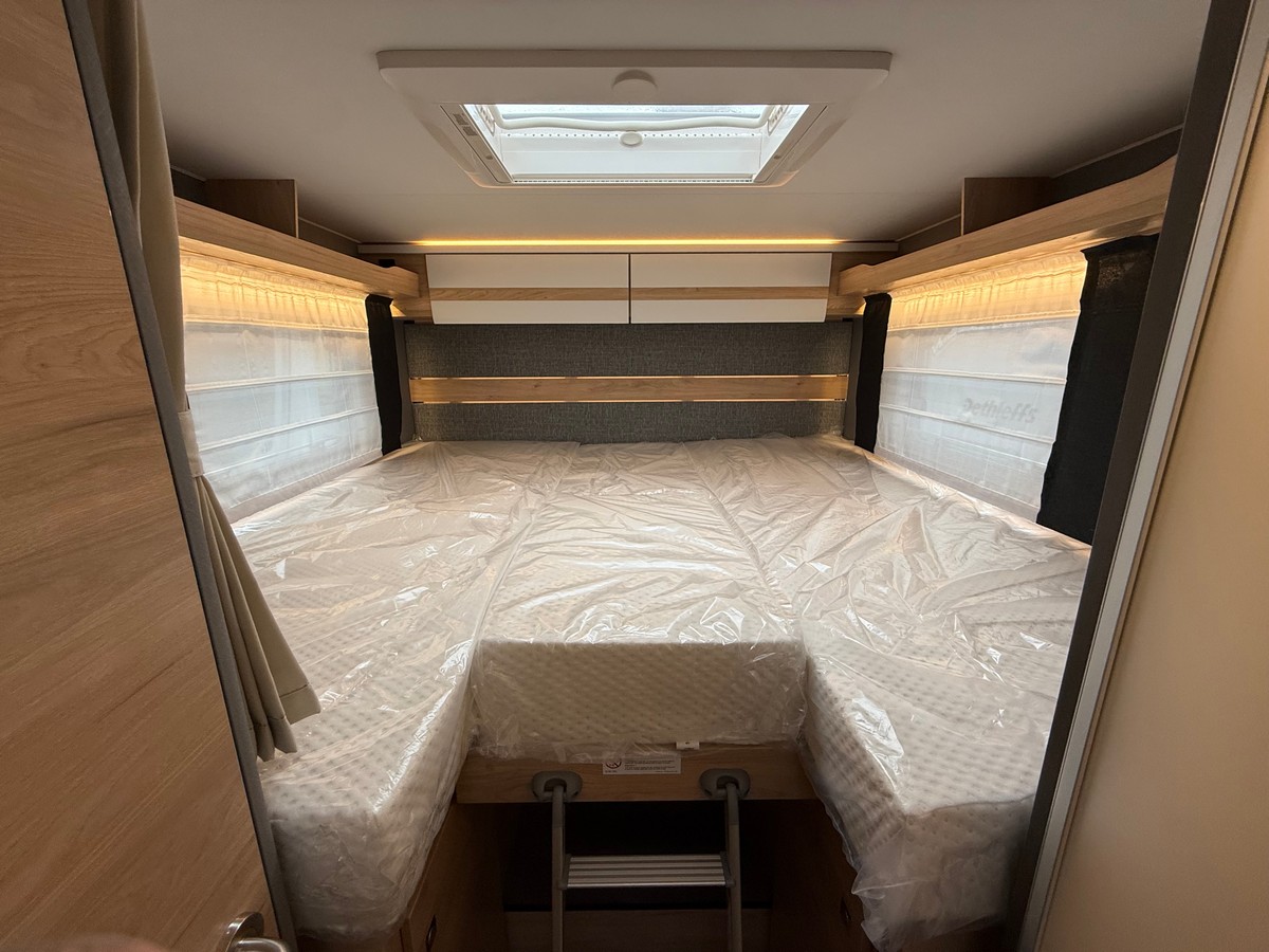 Vonkajšie vybavenie: 70 cm široké nadstavbové dvere, hrúbka podlahy: 49 mm, hrúbka bočných stien: 34 mm a hrúbka stropu: 35 mm, výklopné okno 40 x 40 cm nad sedacou časťou, Dethleffs exkluzívny zadný nosič svetiel s 3. brzdovým svetlom, EPS nadstavbová izolácia, protihmyzová sieťka v nadstavbových dverách, strecha z odolného GFK, Veľká zadná garáž: pravé garážové dvere/klapky s otočným/napínacím zámkom, zadné spustenie (150 kg plošné zaťaženie), protišmyková plocha, vyhrievaná, upínacie lišty, osvetlené, 1 x zásuvka 230 V, technológia nadstavby LifeTime: osvedčená spoľahlivá konštrukcia podlahy a nadstavby s výbornou izoláciou, bočné steny a zadná stena z rezistentného HighGloss GFK s hladkým lesklým povrchom