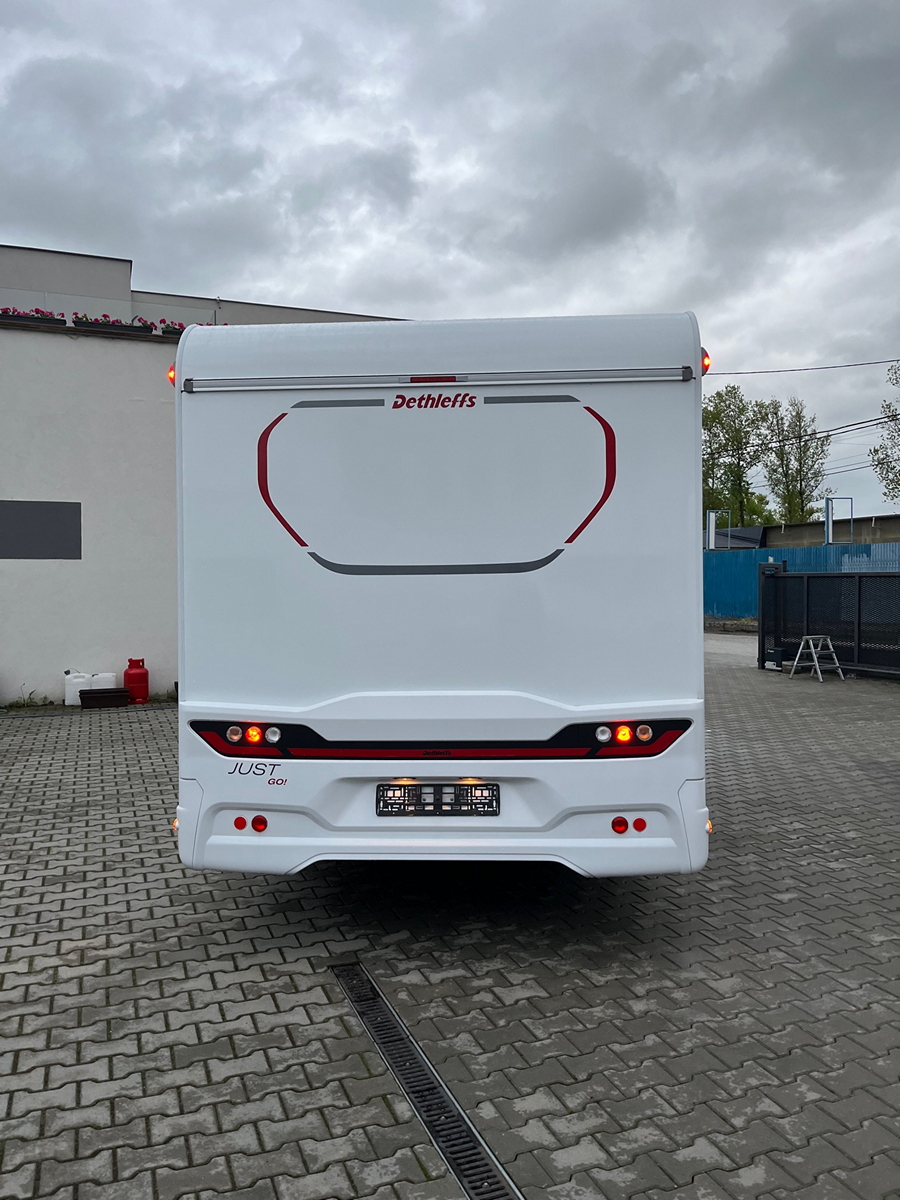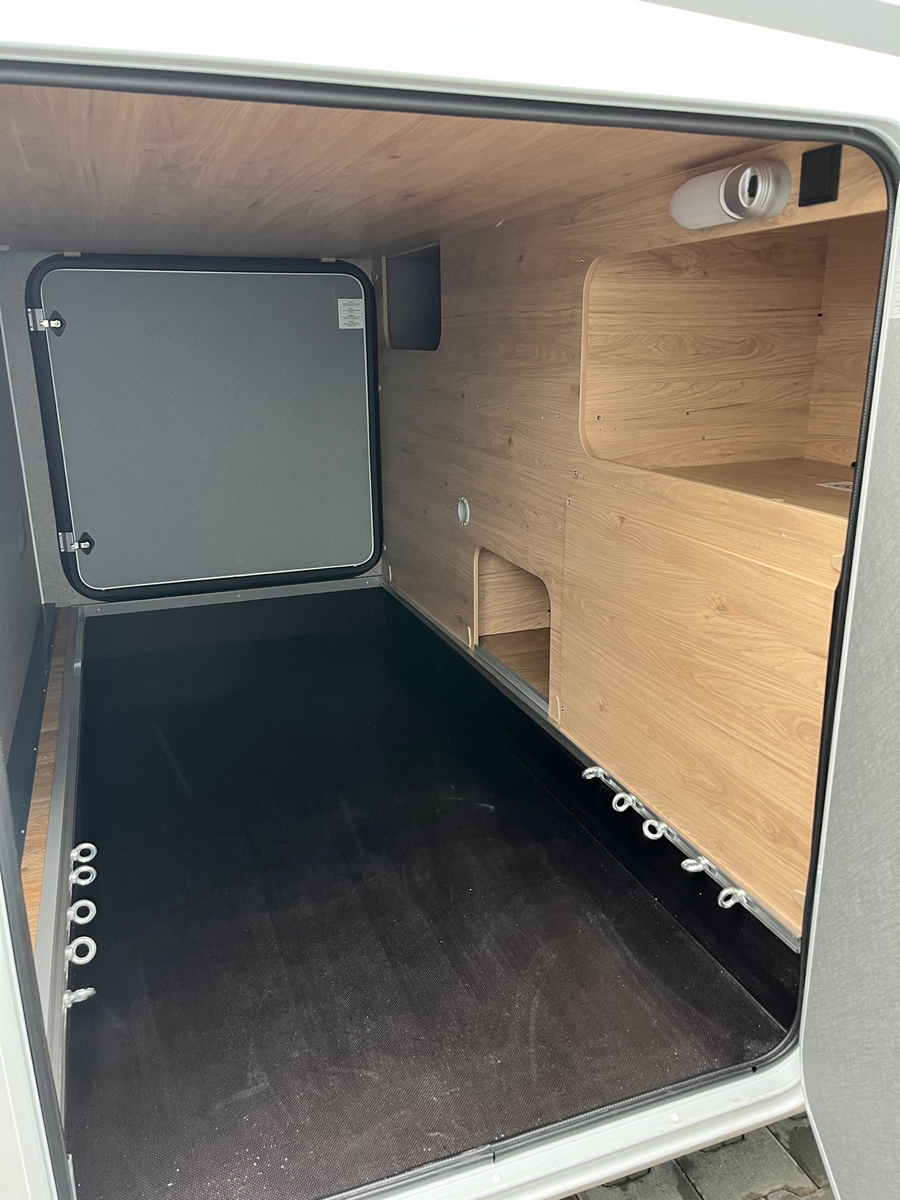 Vonkajšie vybavenie: 70 cm široké nadstavbové dvere, hrúbka podlahy: 49 mm, hrúbka bočných stien: 34 mm a hrúbka stropu: 35 mm, strešné okno 40 x 40 cm nad sedením, EPS nadstavbová izolácia, protihmyzová sieťka v nadstavbových dverách, strecha z odolného GFK, veľká zadná garáž: dvoje garážové dvere/klapky s otočným/napínacím zámkom, zadné spustenie (150 kg plošné zaťaženie), protišmyková plocha, vyhrievaná, upínacie lišty, osvetlené, 1 x zásuvka 230 V, zadný nosič svetiel s 3. brzdovým svetlom, technológia nadstavby LifeTime: osvedčená spoľahlivá konštrukcia podlahy a nadstavby s výbornou izoláciou, spálňové okná vpravo a vľavo, bočné steny a zadná stena z rezistentného HighGloss GFK s hladkým lesklým povrchom, vstupné dvere do obytného priestoru so širokým elektrickým nástupným schodíkom, rámové okná s dvojsklom, zatemnením a moskytiérou
