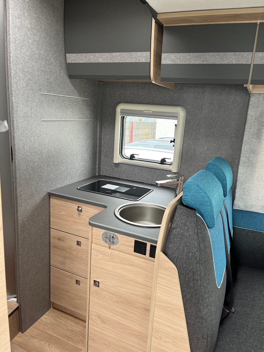 Comfort Paket – hliníkové disky 16“ čierne, airbag spolujazdca, dvere obytného priestoru vrátane zatemnenia a centrálneho zamykania (vrátane dverí vodiča), výklopné okno v kabíne, zatemňovacie rolety v kabíne, panoramatické okno 70x50 cm v obytnom priestore