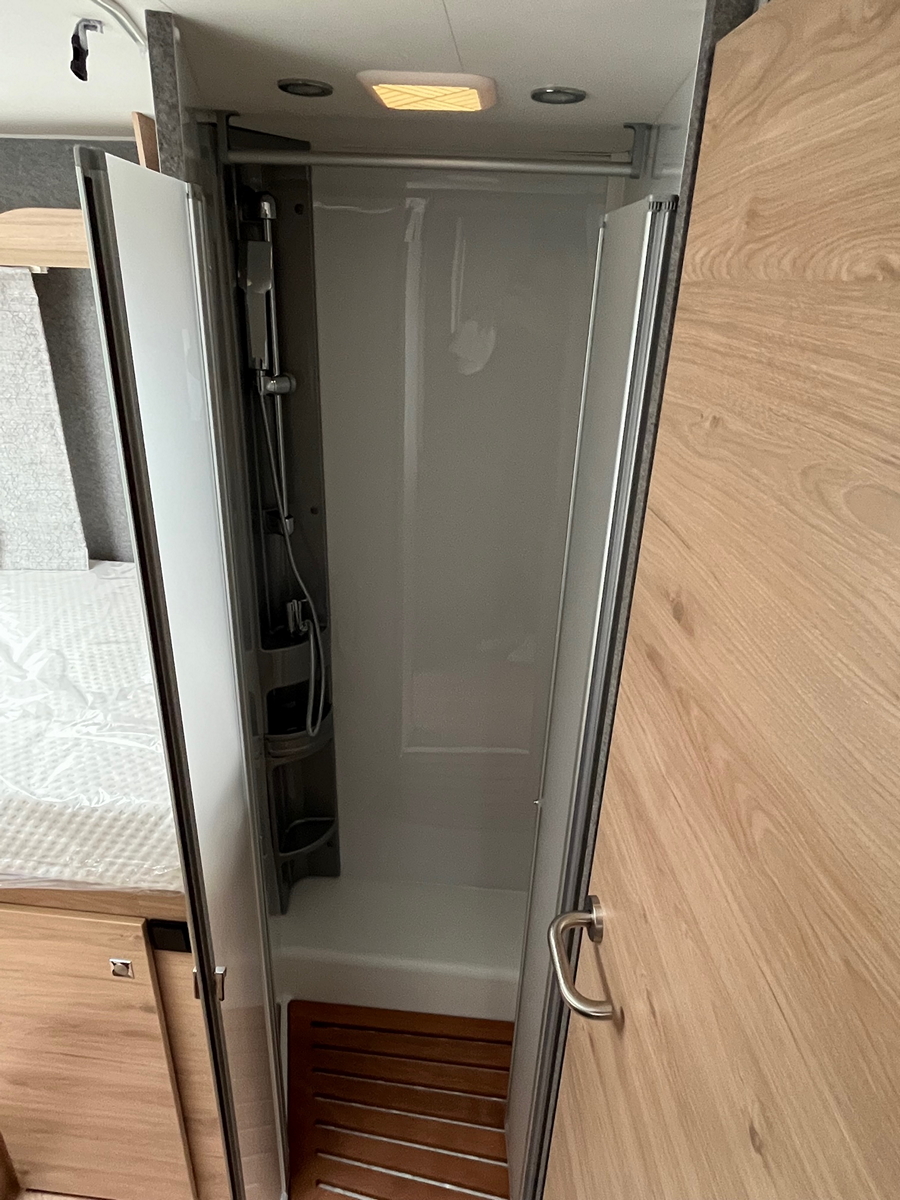 Elektroinštalácia: nadstavbová batéria AGM, 95 Ah, baldachýn nad nadstavbovými dverami, kontrolný panel, stmievateľné LED osvetlenie v oddelenej sprche a toalete, EBL s integrovanou ochranou prepätia a samostatným ističom, LED podsvietenie v celom vozidle, počet zásuviek 1x 12V, 8x 230V, 4x USB, predstanové svetlo 12 V, oddeľovač na štartovaciu a nadstavbovú batériu a chladničku