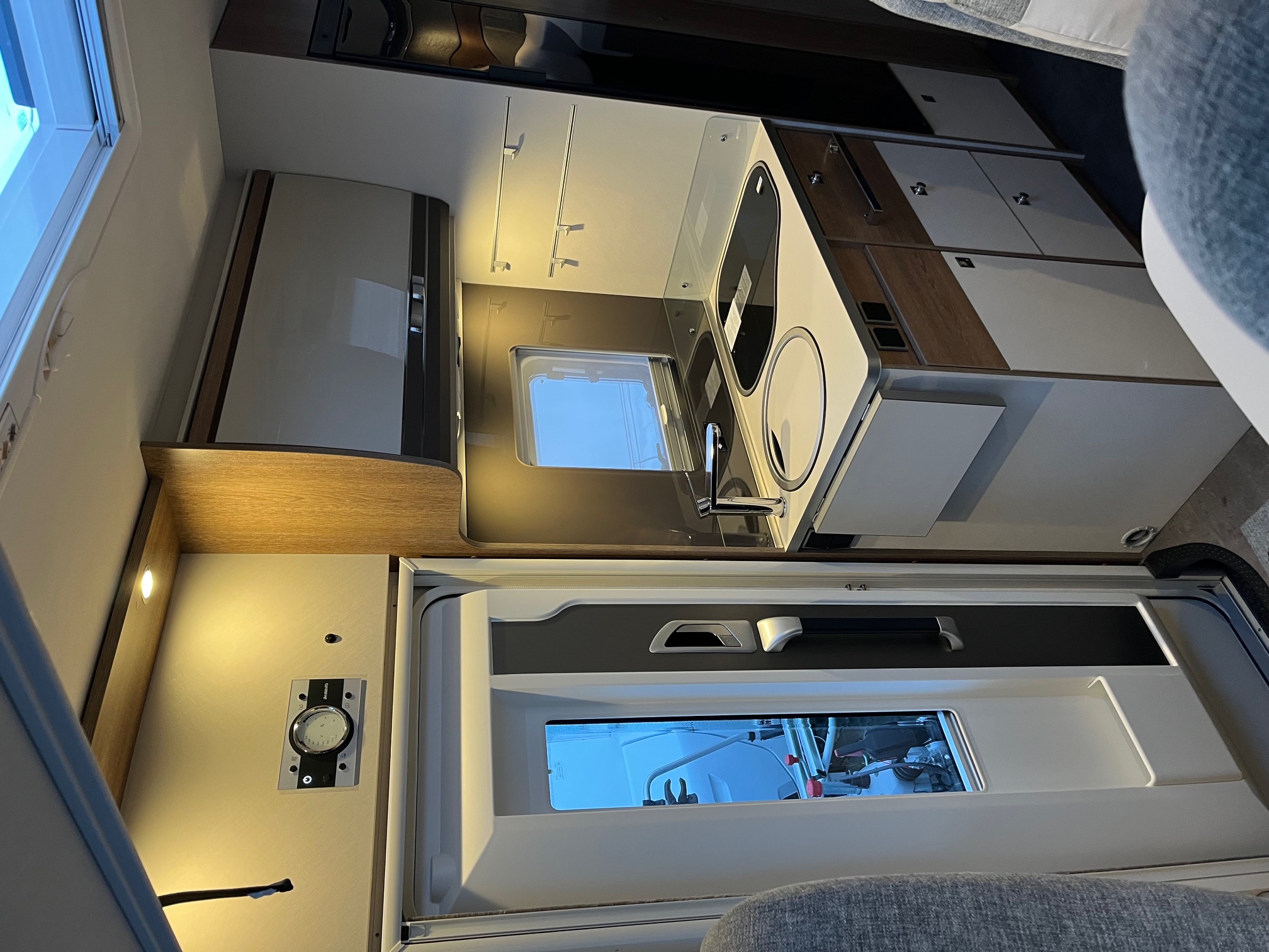 skrinka na 2 plynové fľaše po 11kg, spínacia automatika pre štartovaciu a interiérovú batériu ako aj chladničku, EBL s prepäťovou ochranou, LED – osvetlenie v celom vozidle, baldachín s osvetlením nad dverami do nadstavby