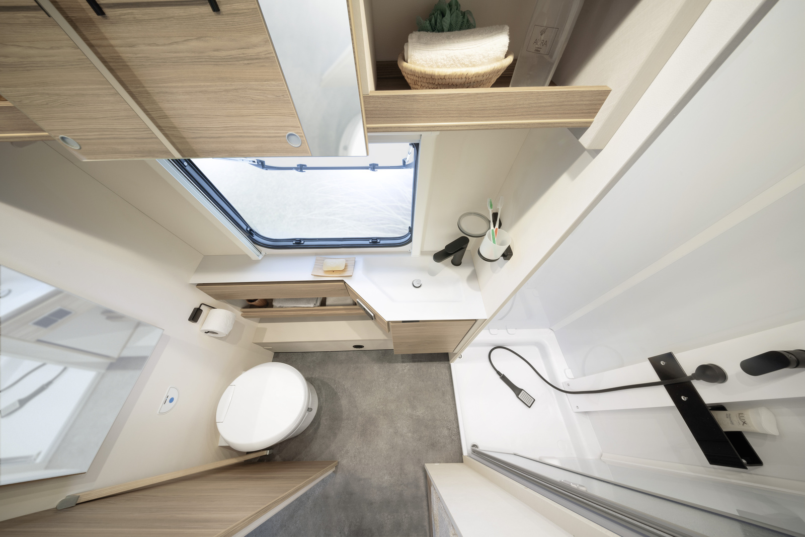 Veľké okno so sieťkou proti hmyzu a zatemňovacou roletou zabezpečuje potrebnú výmenu vzduchu po sprchovaní. • 490 EST