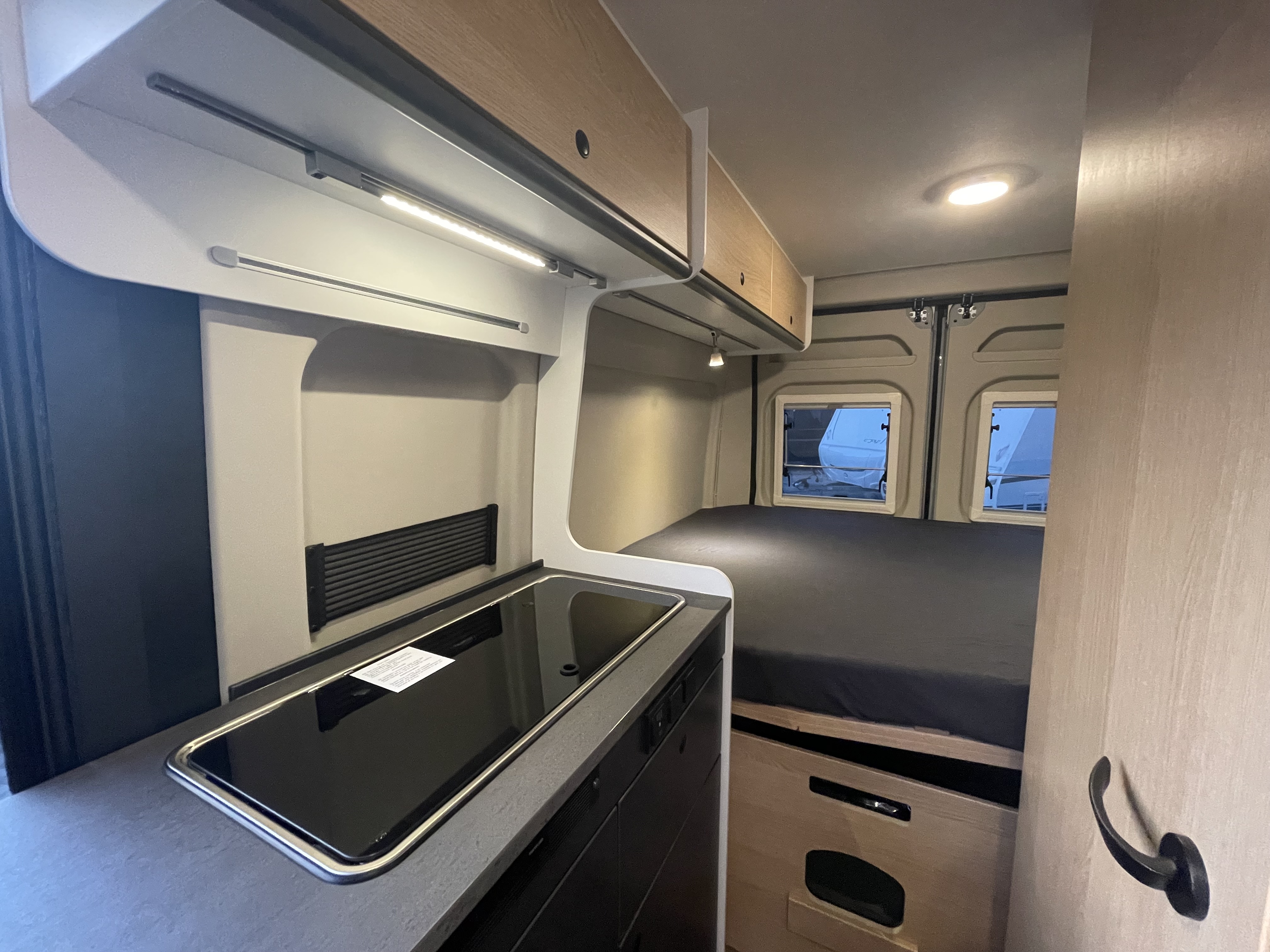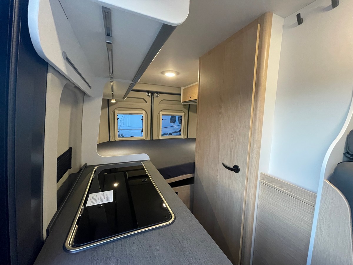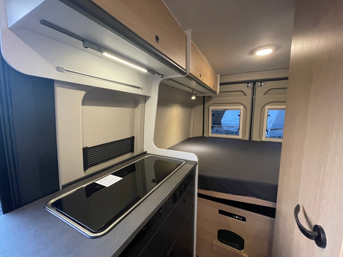 Kuchyňa: ergonomicky usporiadaná kuchyňa s veľkorysou pracovnou plochou, priestranné šuplíky v kuchynke s dojazdom, 2-horákový sporák s elektrickým zapaľovaním a skleneným poklopom, úložný priestor za varičom, nádrž na pitnú vodu 100 l, nádrž na odpadovú vodu 90 l, kompresorová chladnička 84 l, LED podsvietenie, závesná lišta