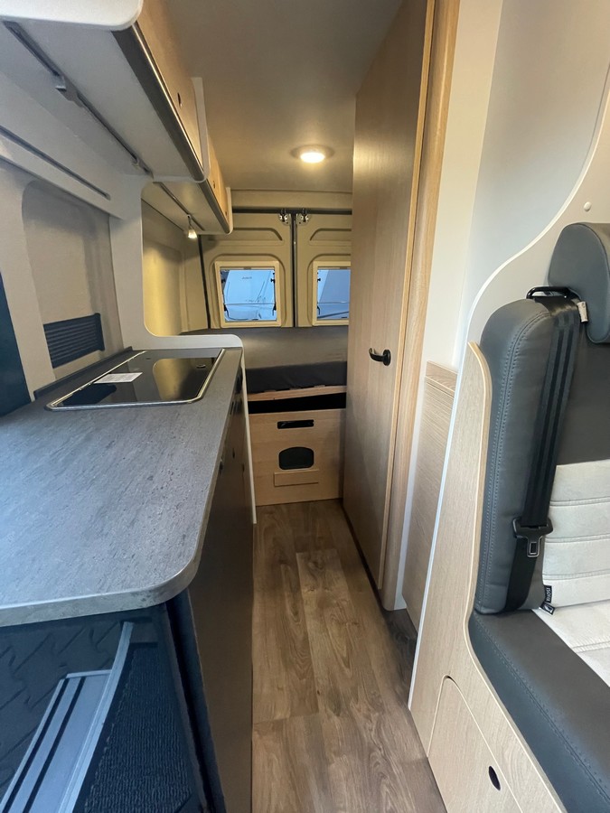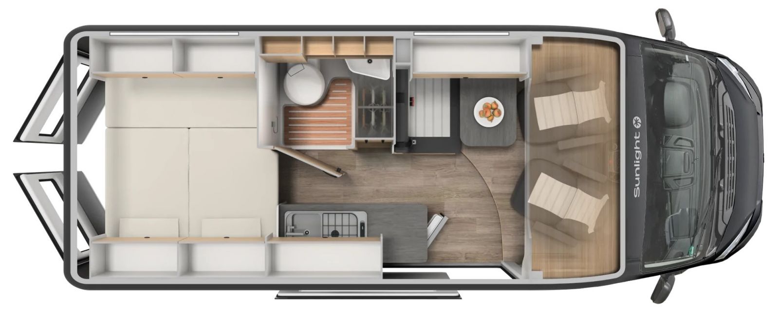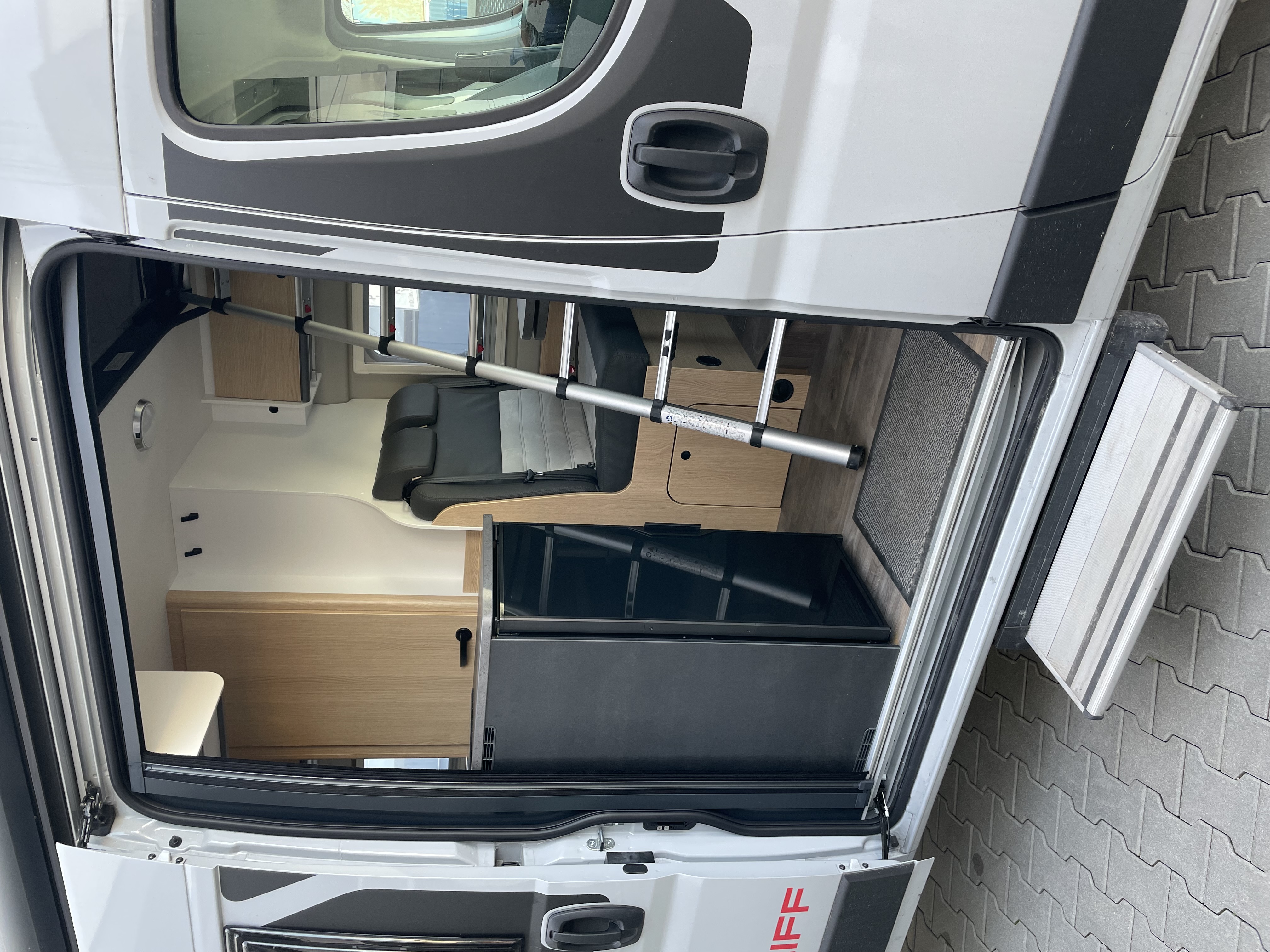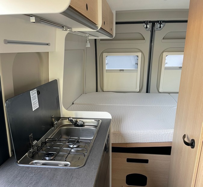 Kuchyňa: ergonomicky usporiadaná kuchyňa s veľkorysou pracovnou plochou, priestranné šuplíky v kuchynke s dojazdom, 2-horákový sporák s elektrickým zapaľovaním a skleneným poklopom, úložný priestor za varičom, nádrž na pitnú vodu 100 l, nádrž na odpadovú vodu 90 l, kompresorová chladnička 84 l, LED podsvietenie, závesná lišta