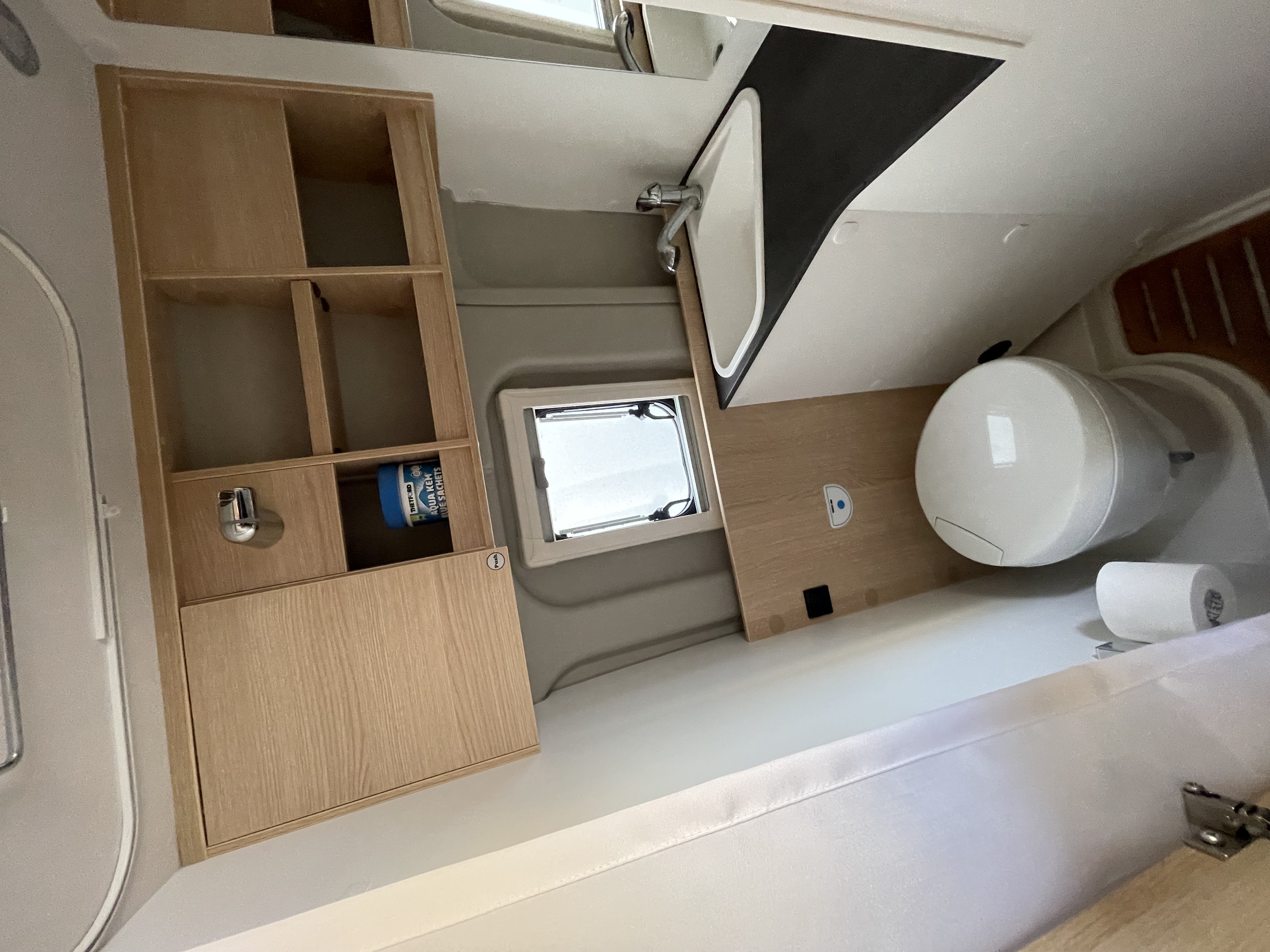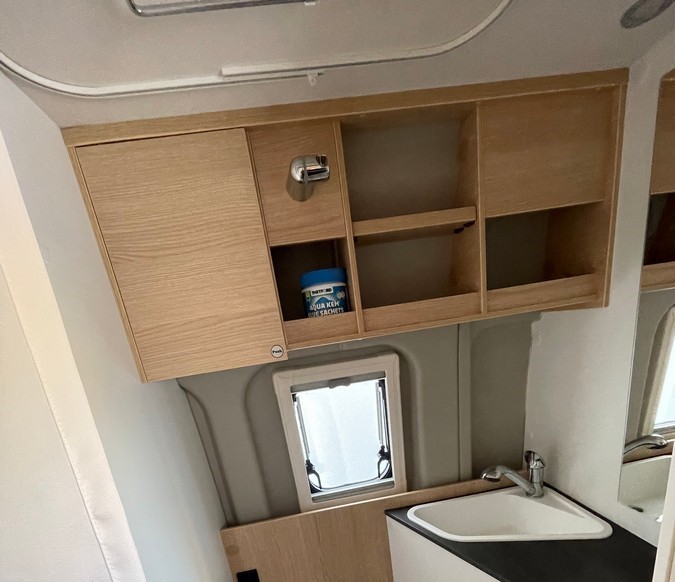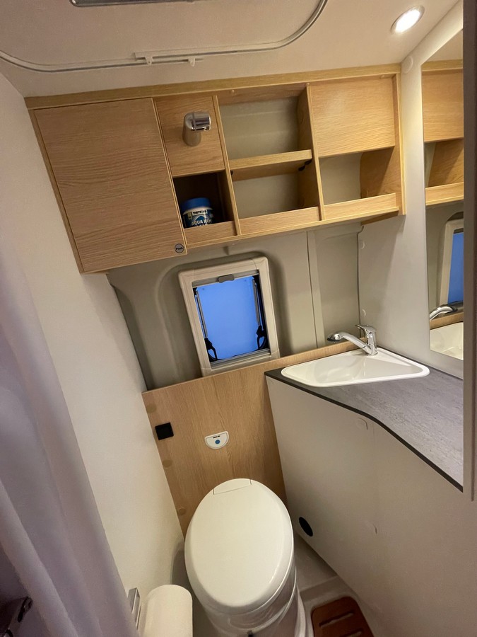 Kúpeľňa: pevné umývadlo, veľkorysý odkladací priestor, kazetové WC C 223, zabudované LED osvietenie v kúpeľni, strešné okno s integrovanou moskytiérou
