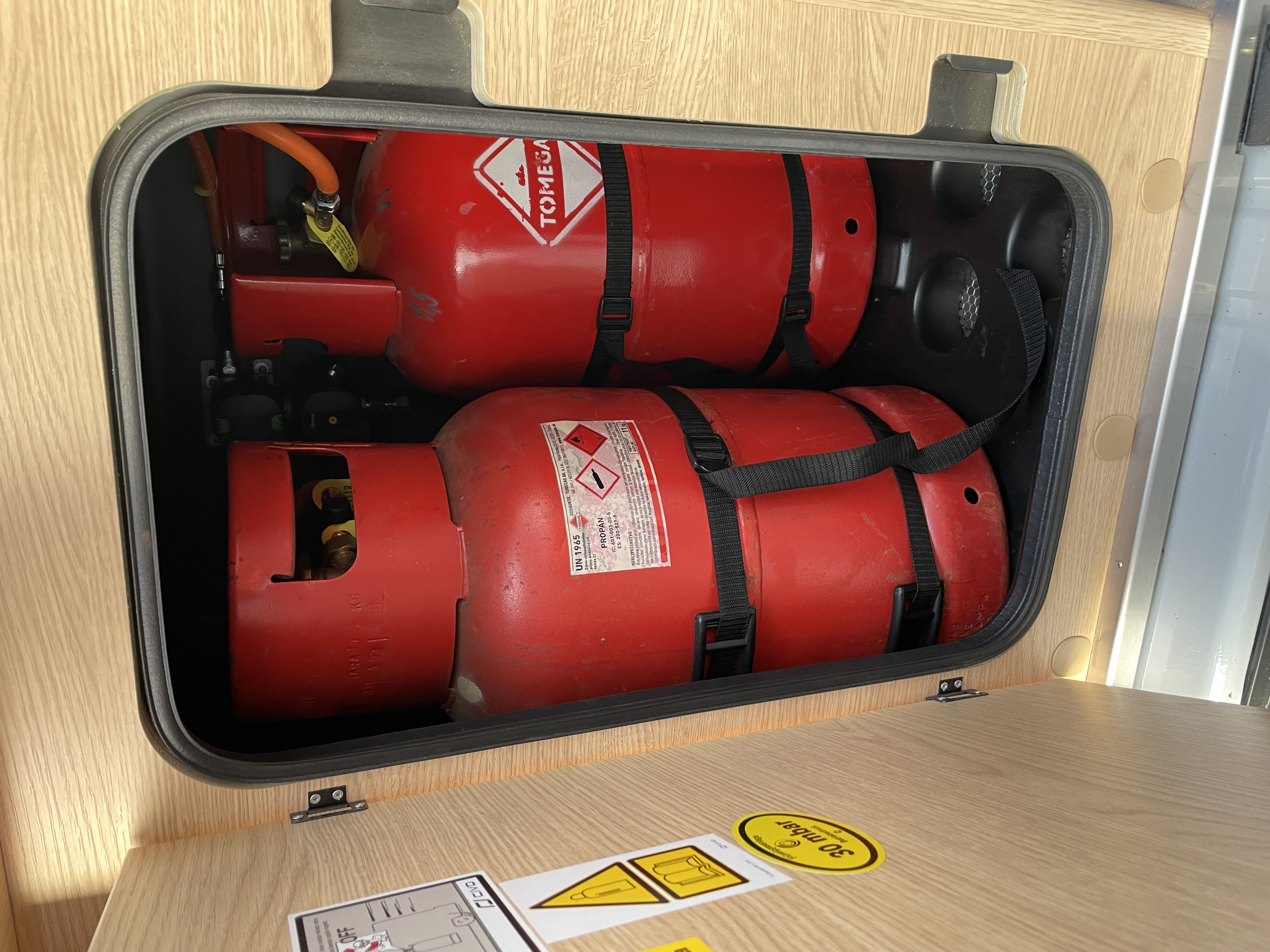 Kúrenie / Plyn: skrinka pre 2 plynové fľaše s maximálnou hmotnosťou 11 kg, dobre prístupné a centrálne usporiadané plynové uzatváracie ventily