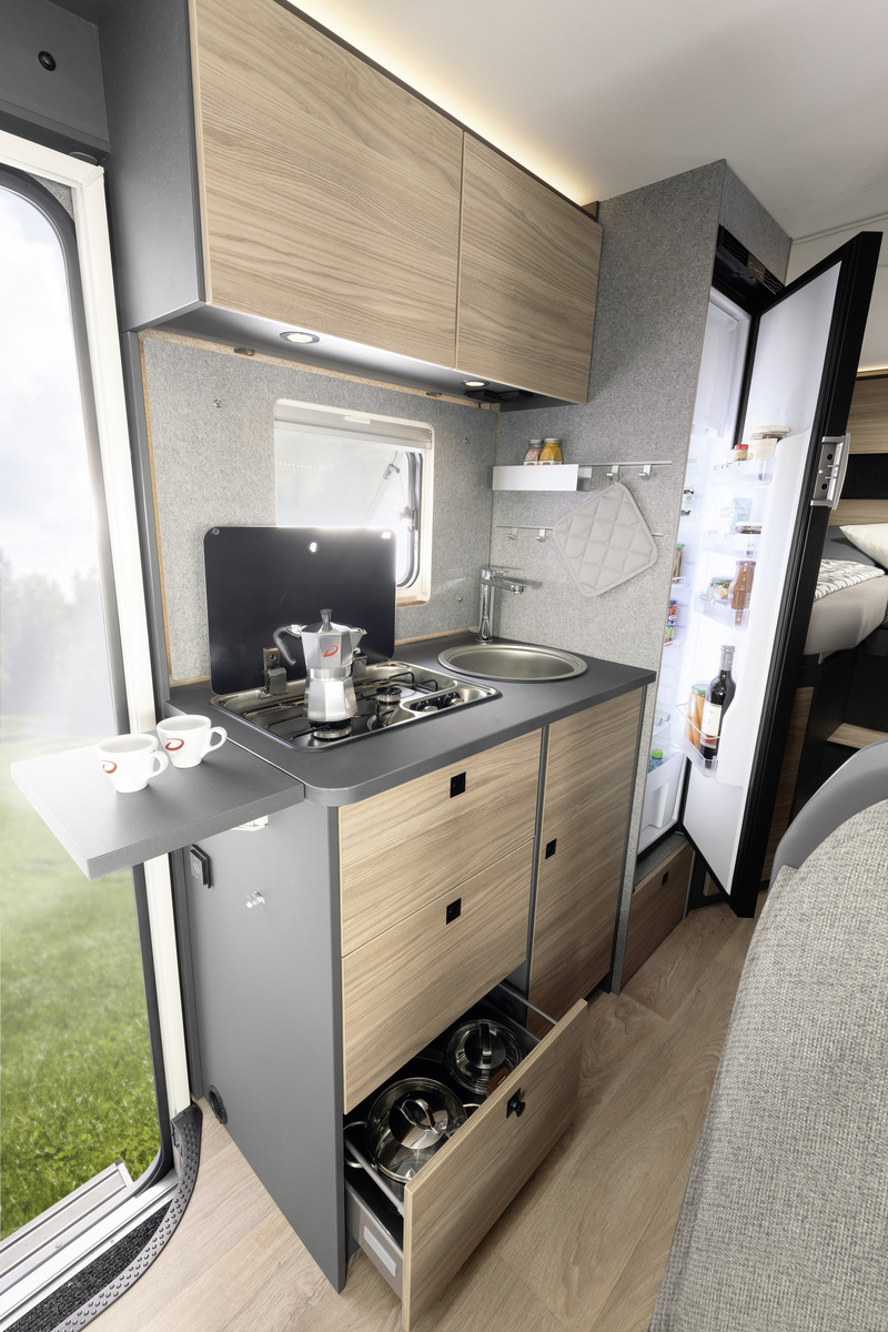Globebus Performance 4x4 je navyše perfektne vybavený na pobyt na odľahlých miestach snov a užívanie si prírody úplne sebestačným spôsobom. Dethleffs kládol veľký dôraz na to, aby bol vo veľkej miere nezávislý od plynu ako zdroja energie. Obytný automobil je vybavený naftovým ohrievačom, ktorý spoľahlivo zabezpečuje teplo v obytnej časti a tečúcu teplú vodu. Maximálnu nezávislosť pri cestovaní zabezpečuje aj plynovo nezávislá, elektricky ovládaná 131-litrová kompresorová chladnička. Na plyn je napájaný iba dvojplatničkový sporák, ktorý je napájaný 2,8 kg plynovou fľašou umiestnenou v spodnej skrinke kuchyne. To nielenže odstraňuje potrebu nosiť veľké, objemné plynové fľaše, ale vytvára aj viac úložného priestoru v zadnej časti.