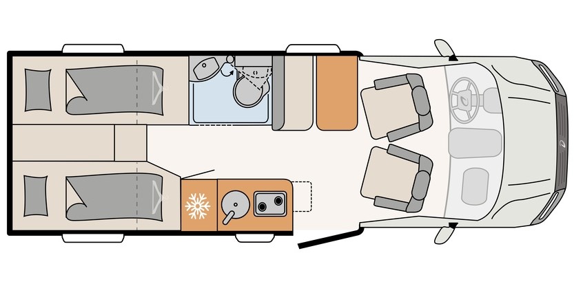 Pôdorys Globebus Performance 4x4 je určený pre dve osoby: vpredu polovičný jedálenský kút, vzadu pohodlné samostatné postele, medzi nimi gurmánska kuchyňa s množstvom úložného priestoru a obrovskou chladničkou a priestranná hojdacia stena oproti.
