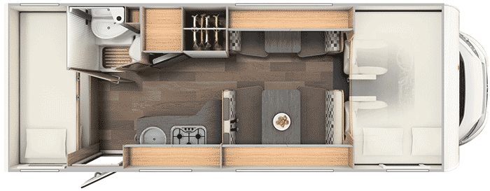 Ergonomicky tvarované podušky pre viac pohodlia pri sedení, kvalitné matrace pri všetkých posteliach pre zvýšený komfort pri sedení, poťahy matracov odnímateľné s vhodné na pranie v práčke, drevený posteľný rošt pri všetkých pevných posteliach pre zvýšený komfort, pohodlné alkovne s bočným oknom vpravo, teplovzdušnými výduchmi, 72 cm výška pre hlavu a s veľkosťou lôžka 210 x 160 cm, sklápacia posteľ v alkovni pre lepší prístup ku kabíne, bezpečnostné siete na posteli v alkovni, poschodových posteliach a pri spúšťacích posteliach veľkorysé odkladacie a úložné priestory, odvetrávanie za skrinkami, dekor dreva Sensual Oak a Cosy White, podlaha Classic Ambience